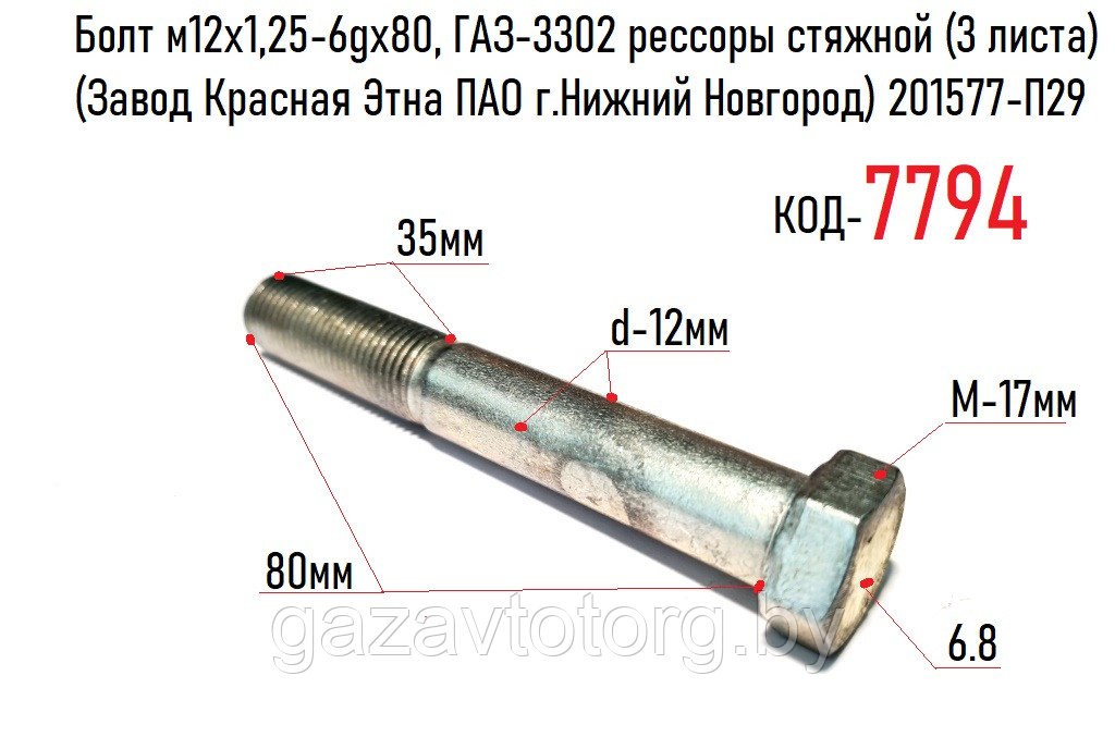 Болт м12х1,25-6gх80, ГАЗ-3302 рессоры стяжной (3 листа) (Завод Красная Этна ПАО г.Нижний Новгород) 201577-П29